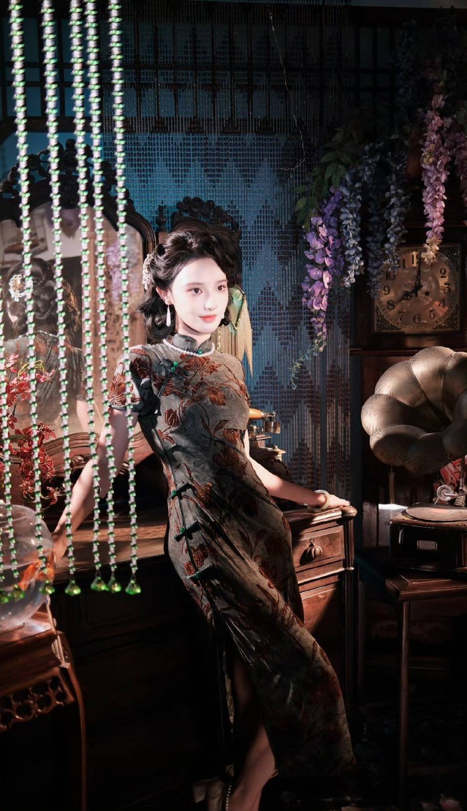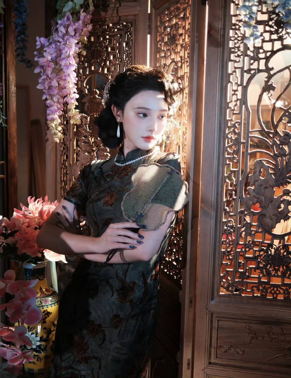 一袭剪裁利落的旗袍,完美勾勒出她的曼妙身姿。立领恰到好处地衬出她那纤细修长的颈线,而手工盘扣更是巧妙地暗藏着中式美学的独特魅力;面料犹如流动的光影,温润而富有光泽,裙摆的开衩处轻轻摇曳,将灵动与端庄完美地融合在了一起。复古卷发搭配上那如远山般的眉形以及娇艳的红唇,她的眼眸流转之间,温婉娴静与飒爽底气兼而有之,一颦一笑都仿佛有着勾人心魄的魔力。